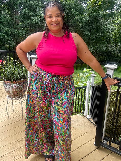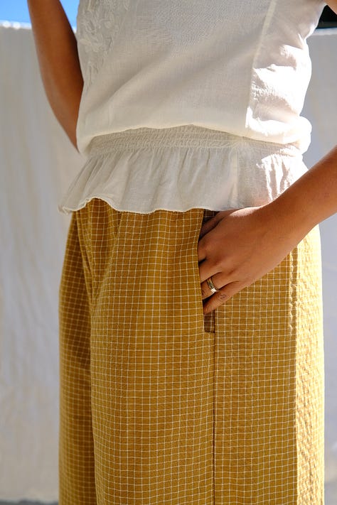 I think anyone who sees me get dressed knows I love a wide-leg, palazzo-style pant. My go-to for knit fabrics is the Patterns for Pirates Palazzo pant. It’s easy and straightforward but I love wearing woven fabrics too so I wanted one that I could use for lighter-weight woven fabrics. This pattern comes in shorts, crop pants, and 3 different inseams. In addition to that, I also created a version that has a gathered side-tier option.